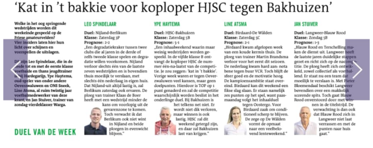 In de wekelijkse voorspellingen van de Leeuwarder Courant komt ook HJSC aan bod. Voorspeller Ype Haytema verwacht dat HJSC met maar liefst 5-1 zal gaan winnen. Zie de foto onder de selectie.