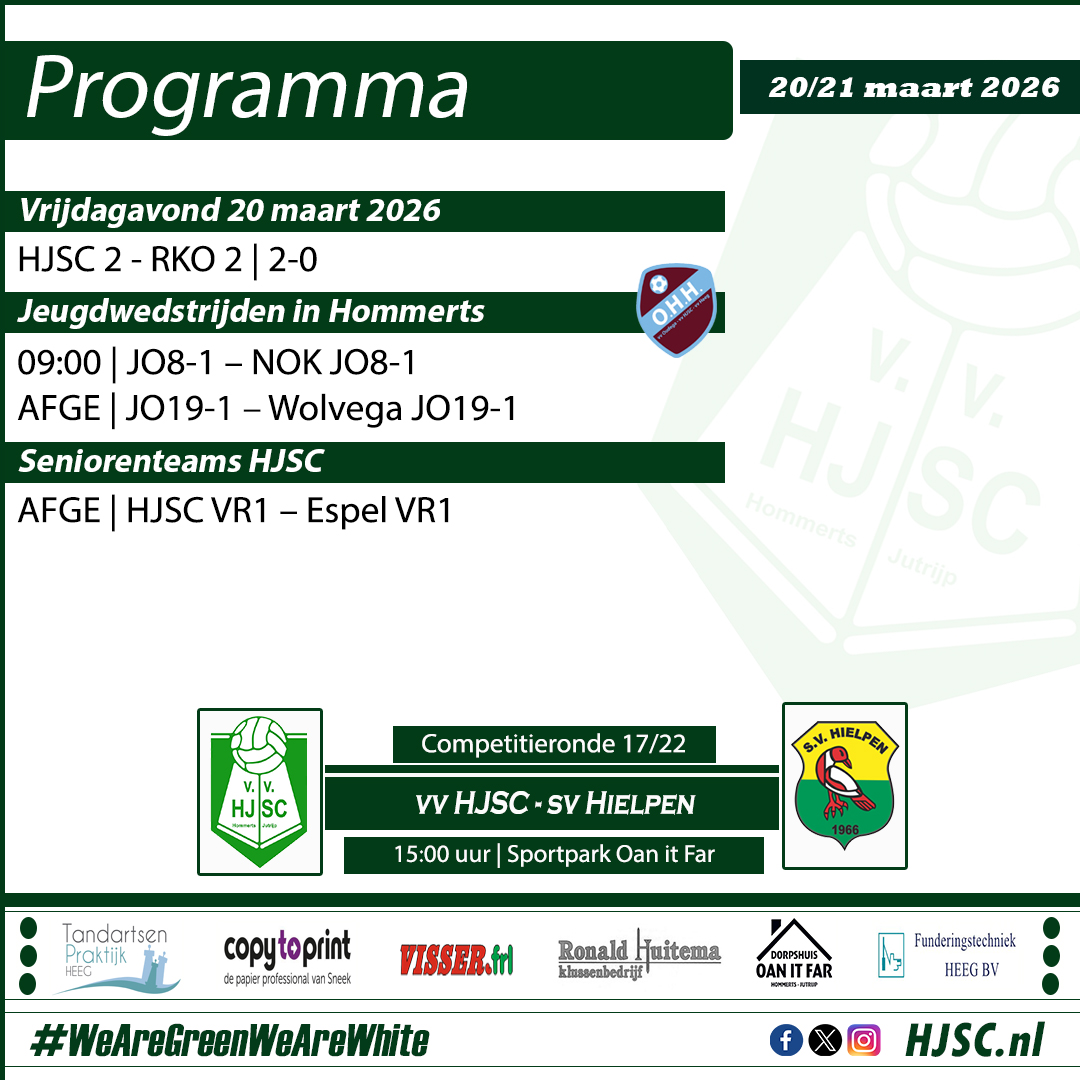 Er staat opnieuw een mooi voetbalweekend op het programma in Hommerts. De kersverse koploper HJSC 1 speelt een thuiswedstrijd. HJSC 2 kwam al op vrijdagavond in actie. De VR1 zijn helaas afgelast.