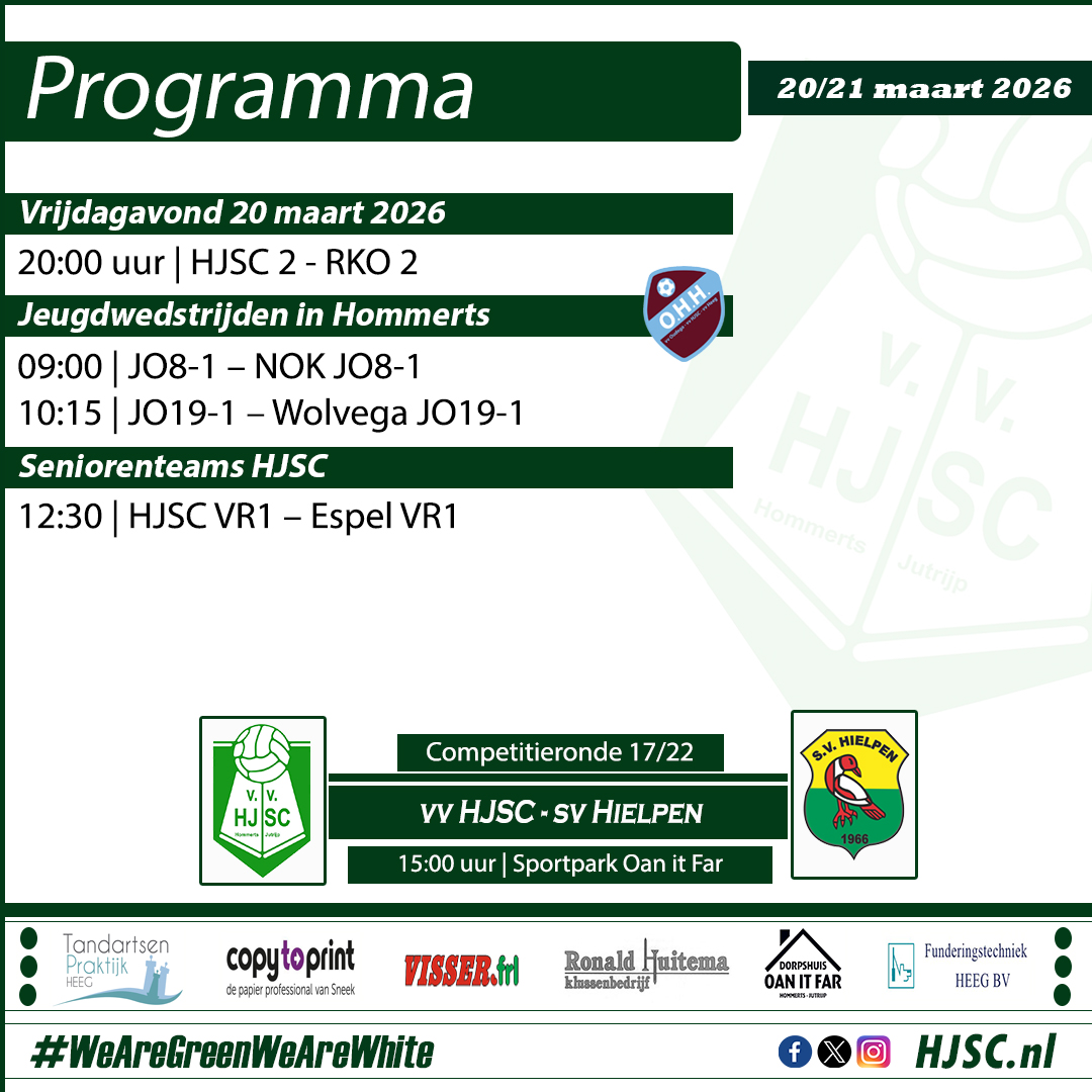 Er staat opnieuw een mooi voetbalweekend op het programma in Hommerts. De kersverse koploper HJSC 1 speelt, net als VR1, een thuiswedstrijd. HJSC 2 komt al op vrijdagavond in actie.