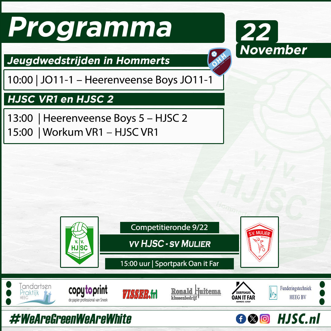 Gezien de vele regen die deze week weer valt moeten we maar eens zien of alle geplande wedstrijden dit weekend doorgang kunnen vinden. Voor HJSC 1 staat een thuiswedstrijd tegen Mulier op de planning terwijl de VR1 en HJSC 2 uitwedstrijden spelen.