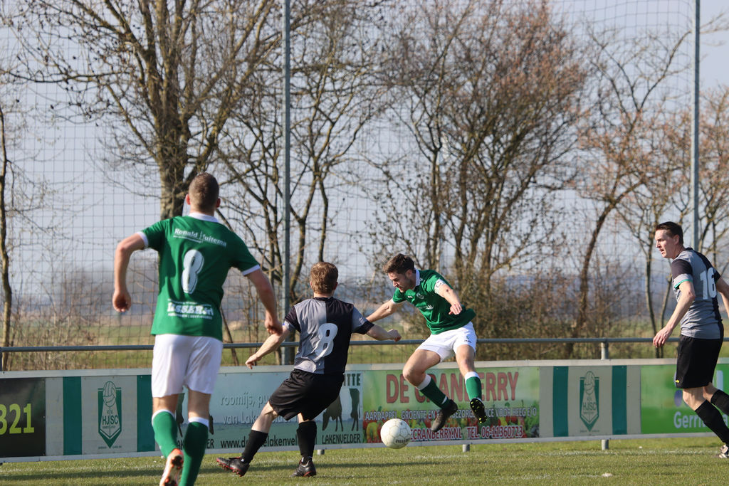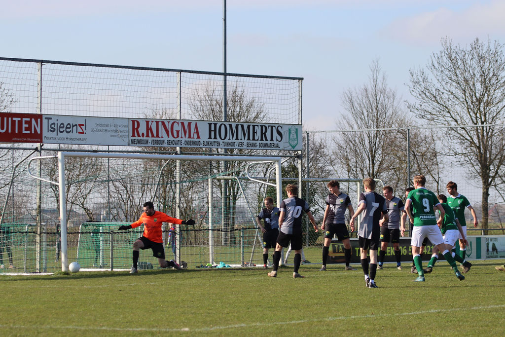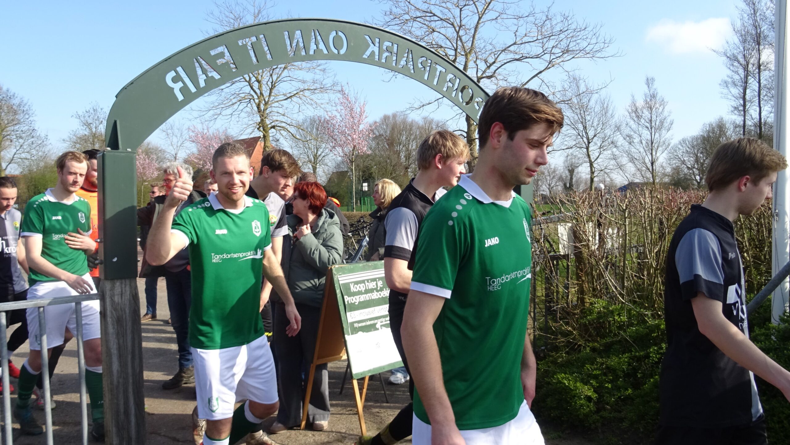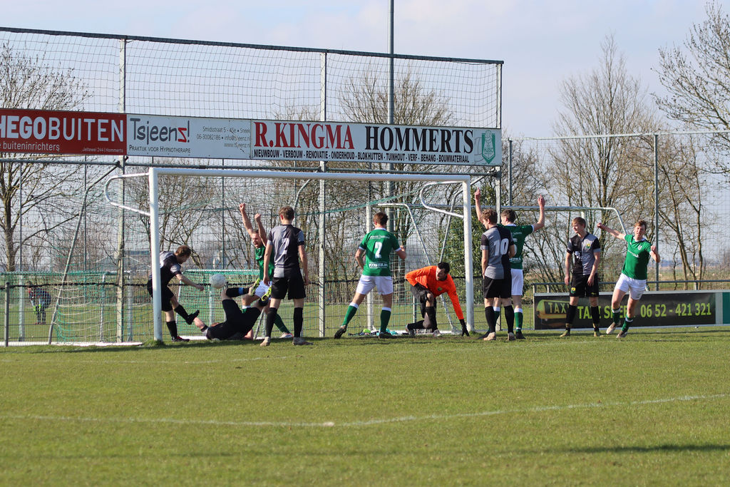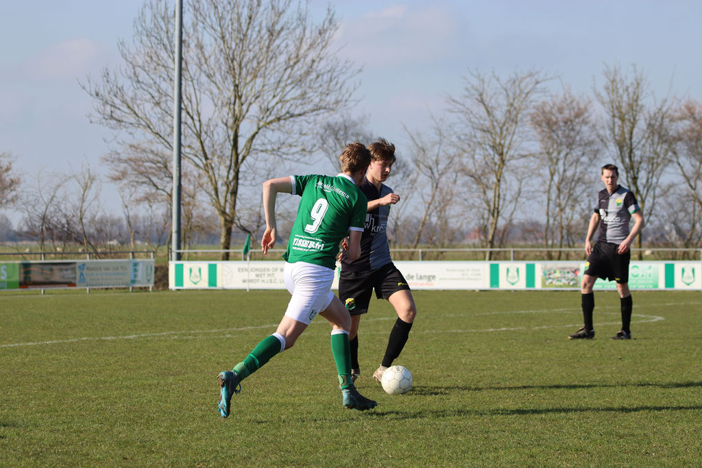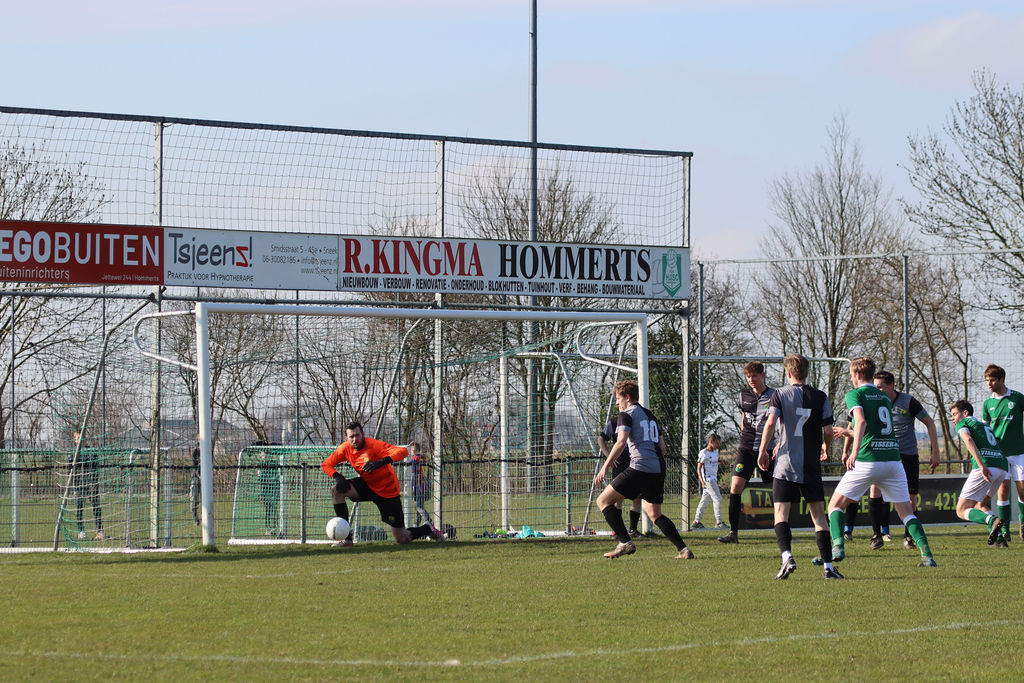 De eerste echt grote kans was een één-op-één met doelman Erro Hofstra, die als winnaar uit de strijd kwam. Niet veel later moest hij echter alsnog de bal uit het net halen. Een strakke voorzet werd binnengetikt door een aanvaller van Hielpen, waardoor het na zo’n tachtig minuten 1-1 stond. HJSC leek daarmee af te stevenen op puntverlies.