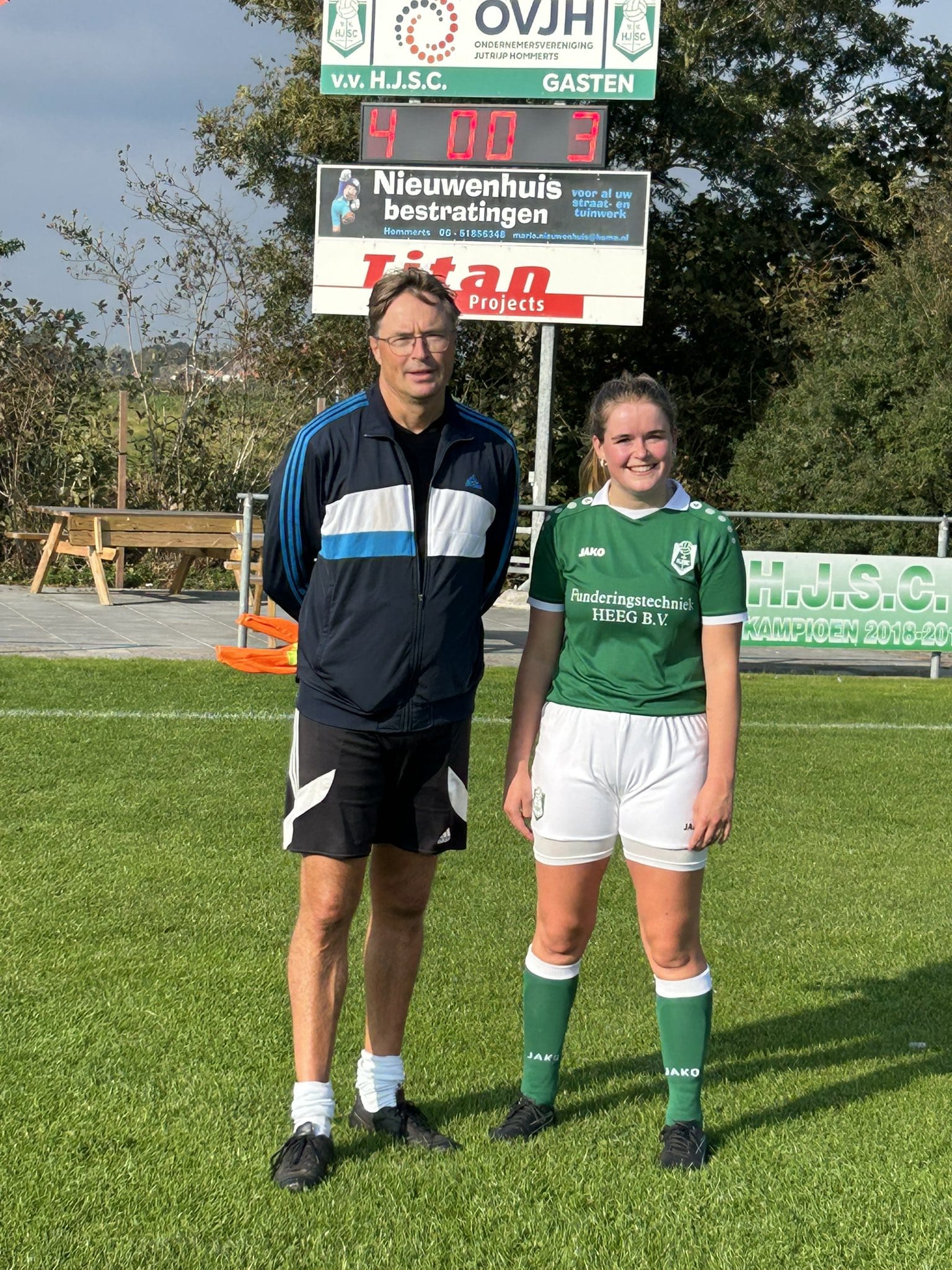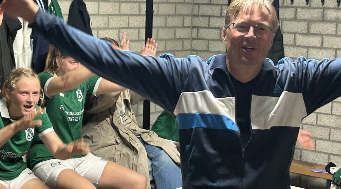 Gelukkig hebben we het snel weer kunnen omdraaien, want ongeveer net zo snel als wij ze tegen kregen, kregen wij ze ook weer voor. Irma was op snelheid en kon de bal voorgeven vanaf links, hier stond Myrthe mooi vrij, die tikte de bal rustig binnen. 3-2! Niet veel later viel ook de 3-3 van Marije. Na een voorzet van Irma, schoot Marije de bal binnen. Zo stond het na (90-30) minuten weer gelijk. De wedstrijd was in de tweede helft in evenwicht, want ook Mildam kreeg nog een aantal kansen. Gelukkig vielen deze niet en werd er goed verdedigd. In de (90-10)e minuut viel de 4-3. Irma schoot de rebound hard binnen in het linkerhoekje. De voorsprong konden we goed behouden en die blessuretijd duurde voor ons gevoel intens lang. Blij waren we dat Willem affloot. Ja je las het goed. Willem floot, onze vlagger wilde voor een keer een andere functie en liep trots met de kaarten op zak. Daarnaast was hij ook nog jarig en werd hij hard toegezongen in de kleedkamer!