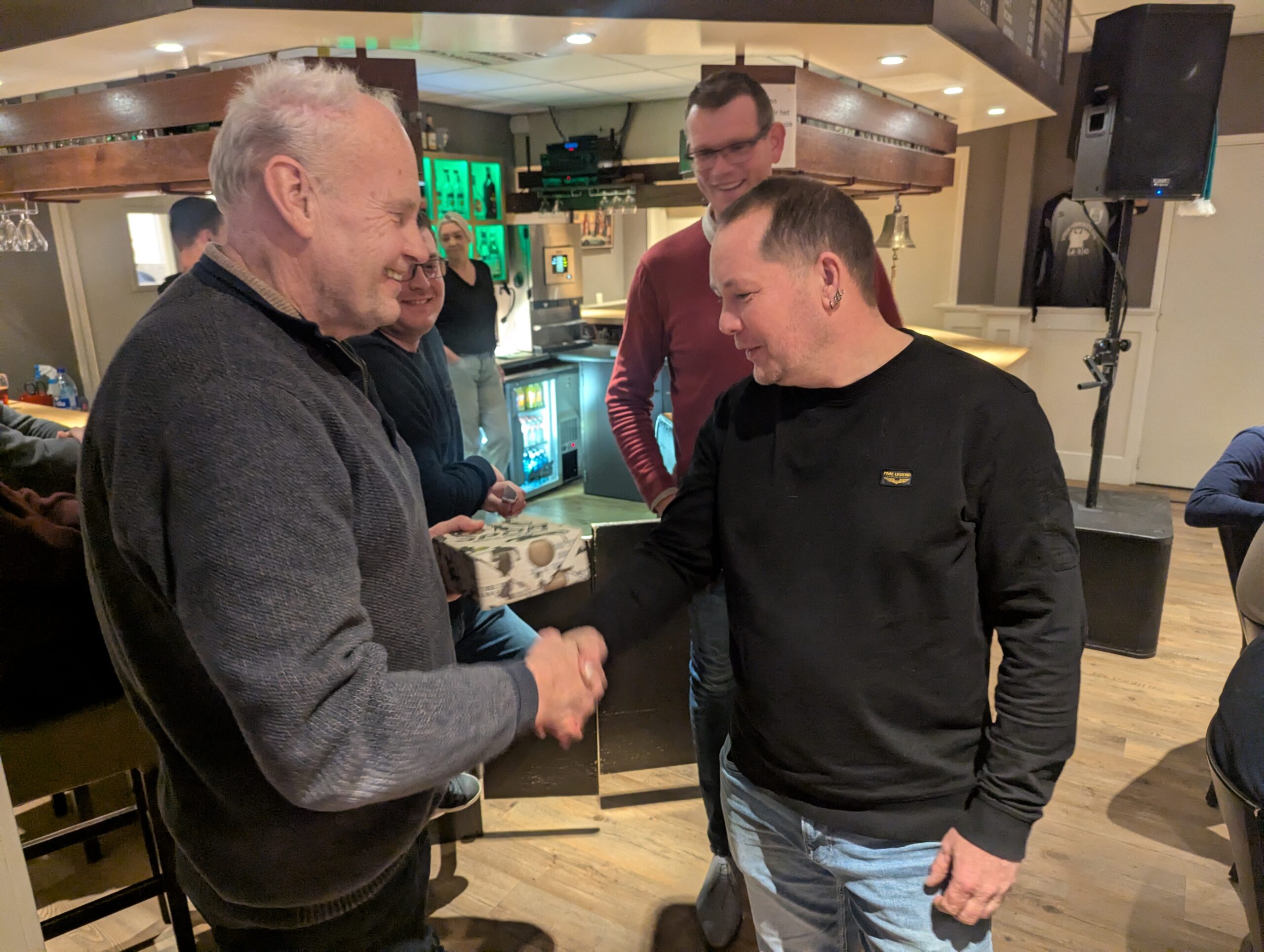 Tot zijn eigen verrassing werd Jan Hielke Schotanus onderscheiden met deze eretitel. Als speler, trainer, grensrechter en in tal van andere rollen is hij al jarenlang nauw betrokken bij de vereniging. Zijn inzet en betrokkenheid zijn van grote waarde voor de club. Binnen het bestuur leefde bovendien de overtuiging dat het opmerkelijk was dat deze onderscheiding hem niet eerder ten deel was gevallen. Onder luid applaus ontving Jan Hielke uit handen van Durk van der Gaast het bijbehorende beeldje – een welverdiende erkenning voor zijn jarenlange toewijding.