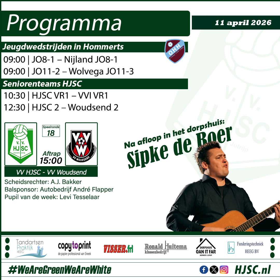 Na afloop van het duel van HJSC 1 komt zanger Sipke de Boer de Jister vermaken. Dat deed hij eerder dit seizoen ook al met succes dus het zal een gezellige derde helft worden in het dorpshuis.