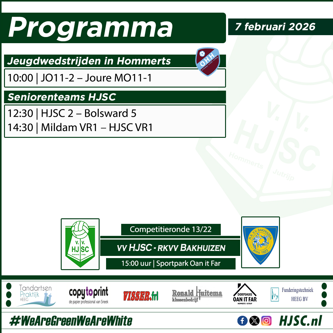 Op Sportpark Oan it Far in Hommerts trapt HJSC 2 (“It Twadde”) zaterdag al om 12.30 uur af tegen Bolsward 5. In een competitie met veertien ploegen heeft HJSC 2 tot nu toe pas tien wedstrijden gespeeld, terwijl we inmiddels in februari zijn beland. Dat maakt de resterende competitie een flinke uitdaging. Zaterdag is dus Bolsward 5 de tegenstander. De ploeg uit Bolsward bezet momenteel de vijfde plaats en kwam tot nu toe negen keer in actie. HJSC 2 staat op de tiende positie met acht punten, maar heeft nog altijd zicht op aansluiting met de middenmoot.
